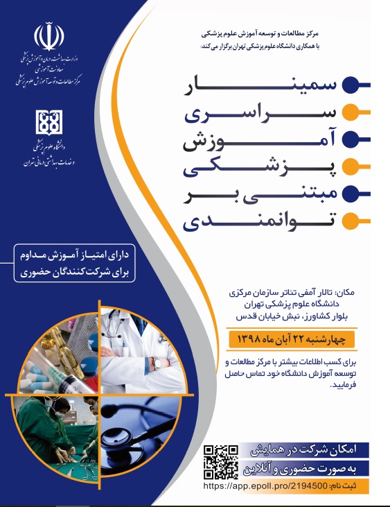 سمینار سراسری آموزش پزشکی مبتنی بر توانمندی در روزهای 22 و 23 آبان ماه 98 با حضور سخنرانان داخلی و بین المللی (بصورت وبیناری) در محل سازمان مرکزی دانشگاه علوم پزشکی تهران برگزار میگردد.