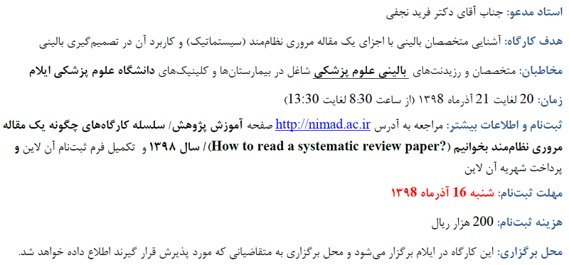 موسسه ملی تحقیقات علوم پزشکی ایران (NIMAD) در نظر دارد کارگاه آموزشی دو روزه " چگونه یک مقاله مرور نظام مند بخوانیم "