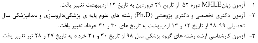 با توجه به وقوع سیل در مناطق مختلف کشور و آسیب هموطنان عزیز ساکن در این مناطق و با توجه به تاکید مقام عالی وزارت برای در نظر گرفتن تمهیدات لازم به منظور رعایت هرچه بیشتر حال عزیزانی که در این شرایط به سر میبرند، تغییراتی در زمان برگزاری برخی آزمون های وزارت بهداشت، درمان و آموزش پزشکی به شرح ذیل داده شده است: